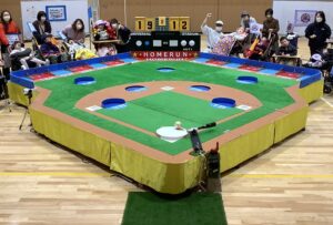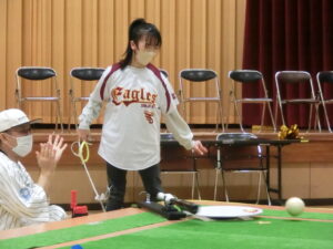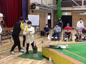 ユニバーサル野球とは、誰でも、ひもを引っ張るだけでバットをスイングできる仕組みの巨大野球盤を使ったスポーツです。ホームランをねらってタイミング良くスイングする児童生徒、力の入れやすい持ち手を使ってひもを頑張って引っ張る児童生徒、先生やお母さんと息を合わせてスイングする児童生徒など、それぞれが打席を楽しんでいました。ウグイス嬢に名前を呼ばれバッターボックスに立つと、「かっとばせ~○○!」「ホームラン!ホームラン!○○!」の大声援が聞こえてきます。一人一人に合った方法でボールを打ち、ヒットで笑い、アウトで叫び、ホームランではハイタッチと、エキサイティングな空間となりました。児童生徒はもちろん、保護者の方々も笑顔あふれる楽しい時間となりました。