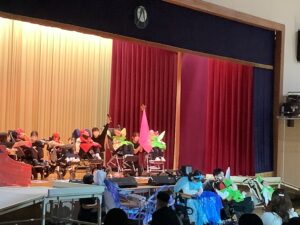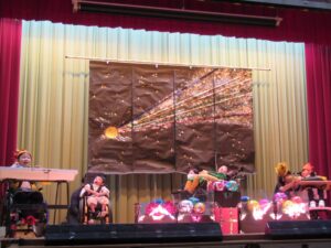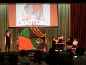 小学部1~3年は「めっきらもっきら どおんどん」の劇をしました。3年生は「子供」、1、2年生は「おたからまんちん」と「きらきらしゃららん」というおばけを演じました。